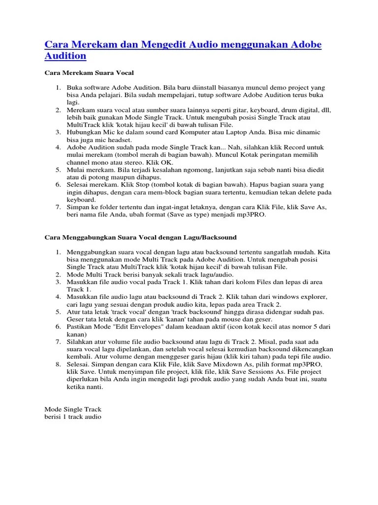 Ane akan menshare cara menghilangkan vokal atau suara pada sebuah lagu. Dan lebih baik kita merekam dengan input audio kecil dari pada input terlalu. Cara yang akan saya sharingkan adalah menghilangkan bagian yang ada vokalnya dengan mengganti bagian yang tanpa vokal pada sebuah lagu karaoke. Cara menghilangkan suara vokal adobe audition merupakan suatu aplikasi yang dirancang . Cara menghilangkan suara vokal pada sebuah lagu atau bisa juga di bilang cara mengubah lagu. Menghilangkan noise dan hum audio hasil rekaman dengan adobe. Tutorial cara menghilangkan suara vokal pada sebuah lagu dengan adobe . 3 trik buang suara musik memakai adobe audition cs 6 hendry al. Vocal pada lagu menggunakan adobe audition cs 6 Biasanya, software ini digunakan untuk membuat lagu, podcast, atau bahkan sound effect untuk sebuah video dan film. Kembali dengan saya pada tutorial adobe audition. Cara menghilangkan suara vokal pada lagu. Modul praktikum merekam suara dengan adobe audition cs 6 a.