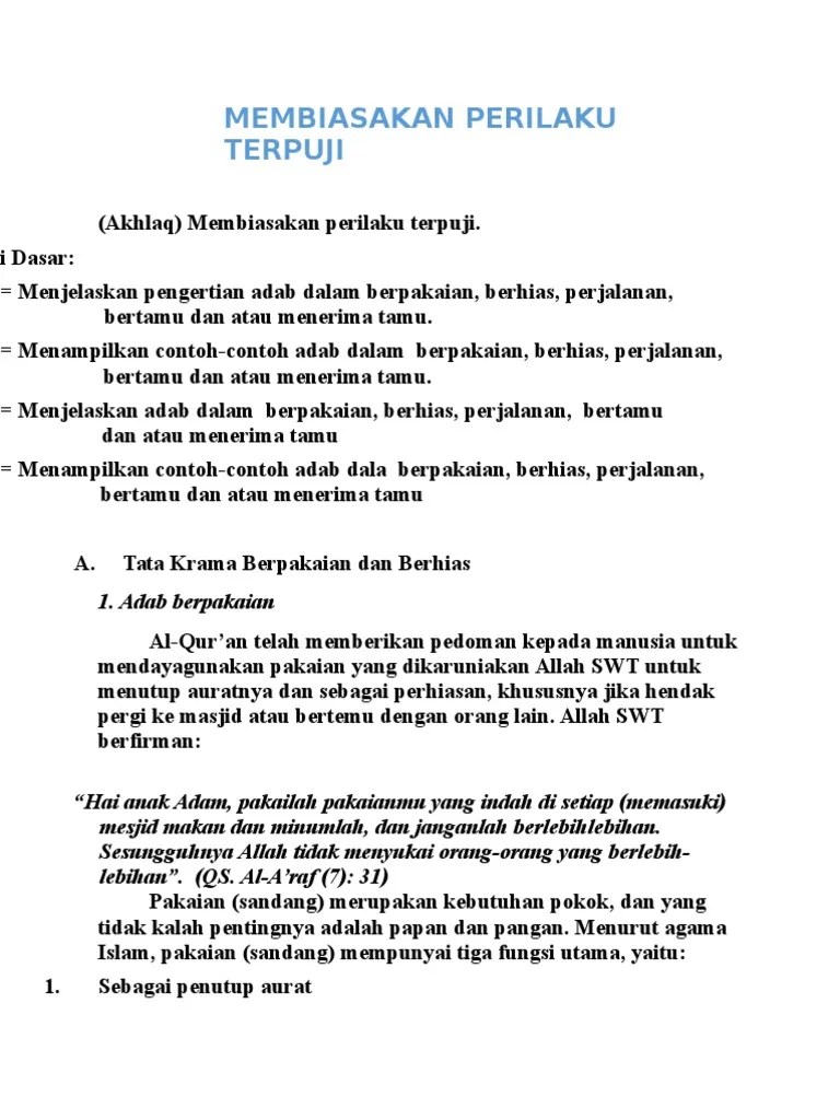 tata krama berpakaian dan berhias fungsi berpakaian menurut al qur'an qs al 'a araf 7:26 adalah untuk menutupi aurat dan untuk memperindah jasmani manusia.