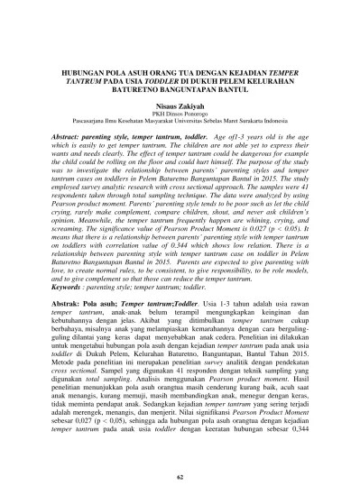 Hubungan pola asuh orang tua dengan kejadian temper. Untuk mengajukan pertanyaan dari apa yang dilihat, didengar dan dirasakan. Data penelitian ini dianalisis dengan teknik product moment. Tantrum pada anak usia toddler di dukuh pelem. Temper tantrum dan pola asuh orangtua otoriter diperoleh melalui metode angket.